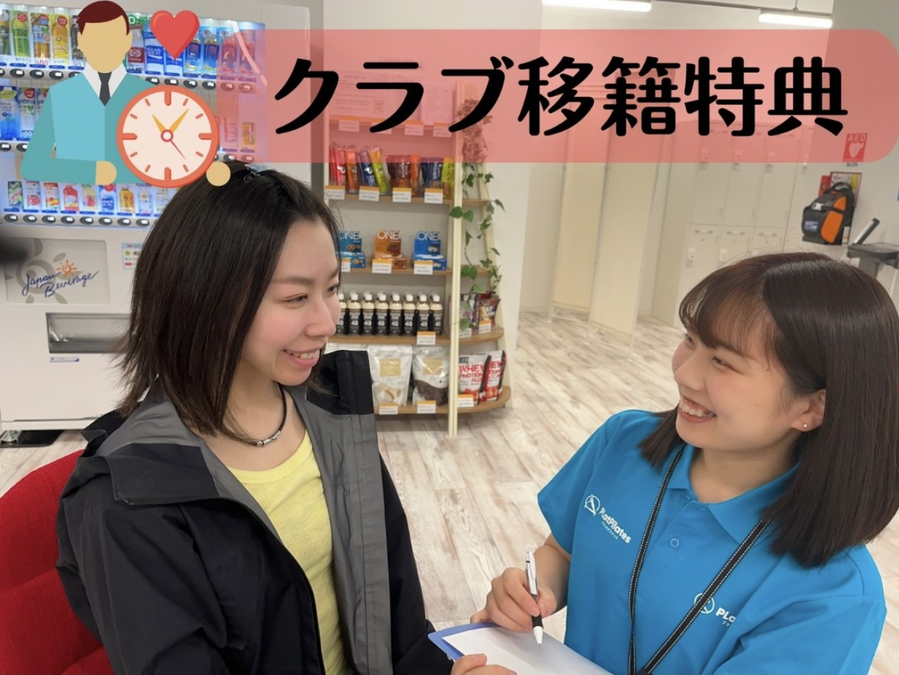 Web入会をお済ませののち、初回店頭入会手続き時に、他フィットネスクラブへの在籍を証明するもの(会員カード、ご利用明細 等)をお持ちいただき、スタッフまでご提示ください。他フィットネスクラブへの在籍の確認をもって、スタッフがクラブ移籍特典への適用を行います。