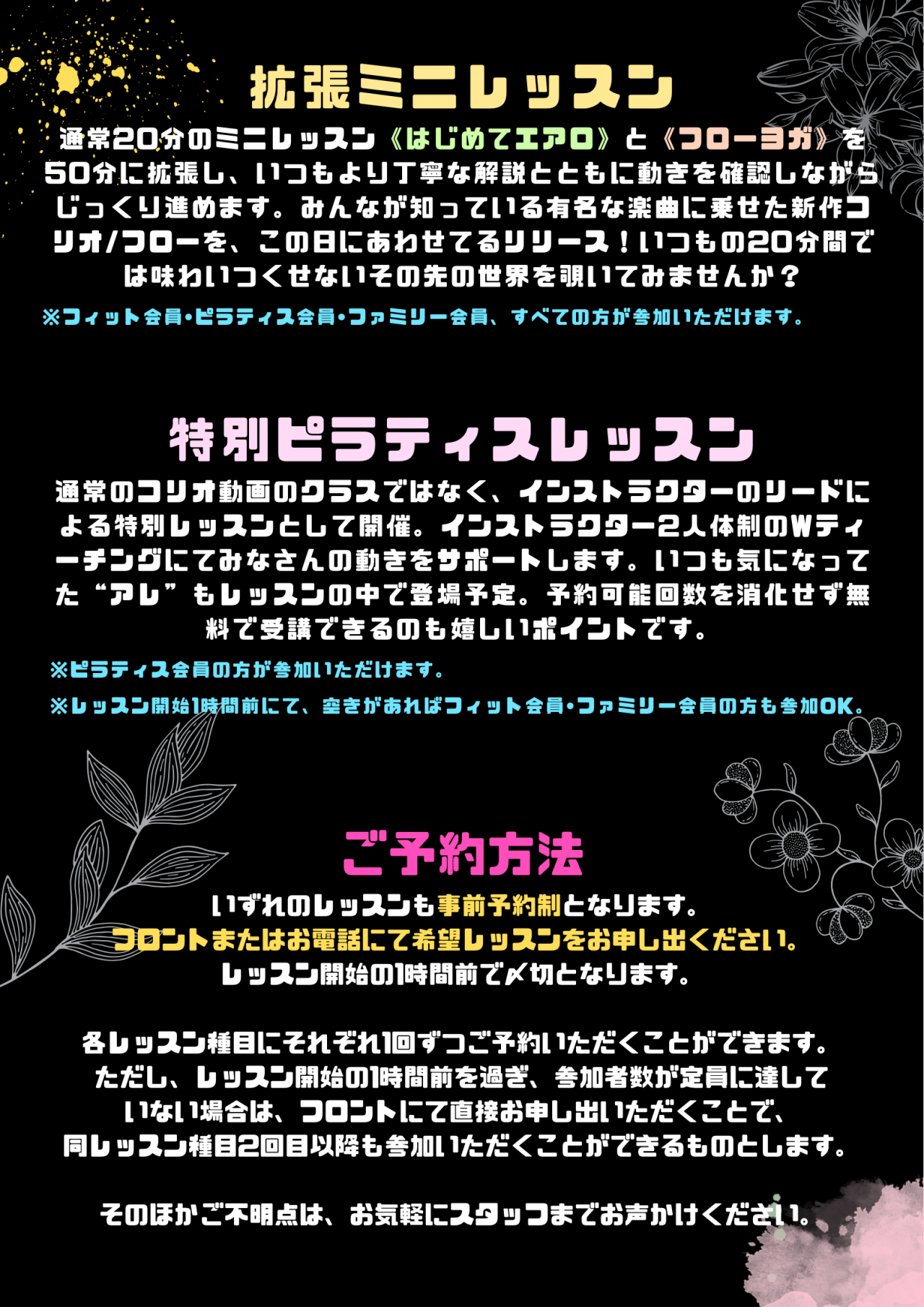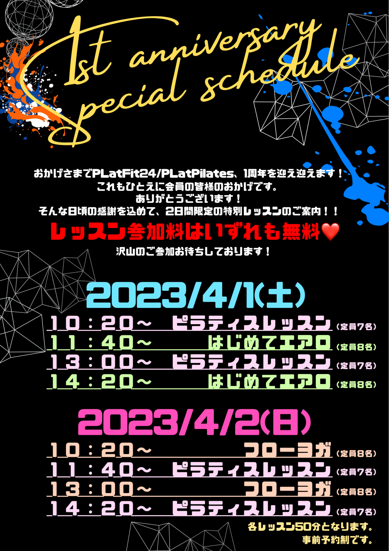 いつもPLatFit24/PLatPilatesをご利用いただき、ありがとうございます。 2023年4月に1周年を迎えることを記念し、4月1日(土)2日(日)に、この2日間限定の特別レッスンを開催いたします。 レッスン内容や予約方法等の詳細は、下記画像をご確認ください。 みなさんのご参加、スタッフ一同 心よりお待ちしております! ※4月1日(土)2日(日)は通常のレッスンスケジュールとは異なりますのでご注意ください。